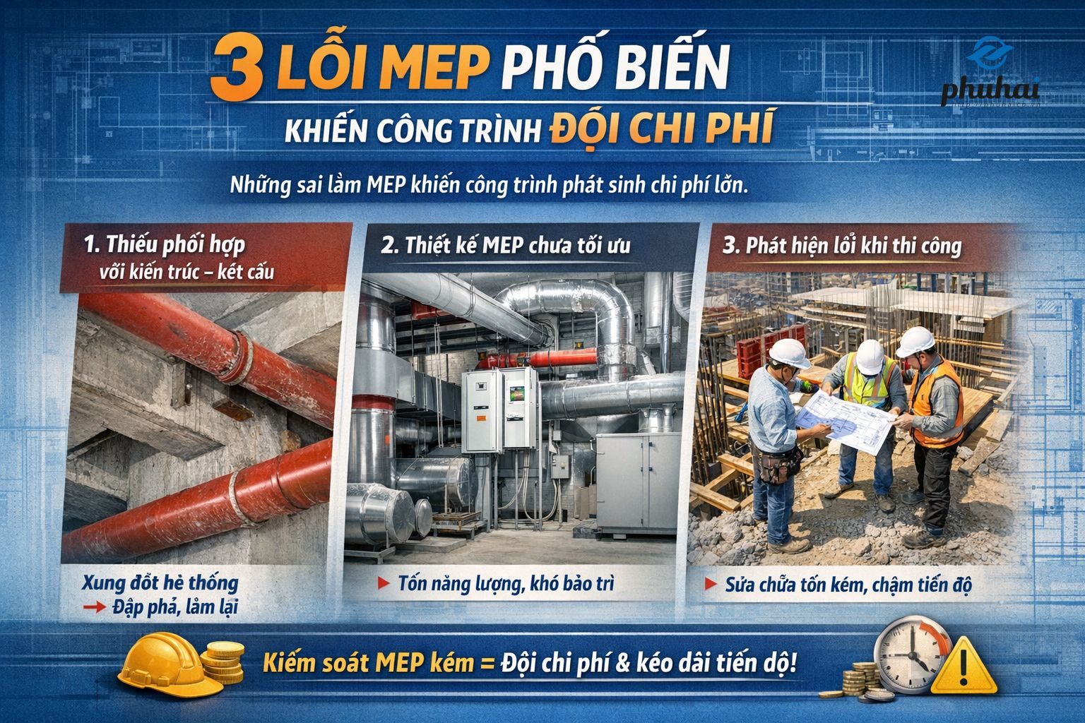 Trong nhiều dự án xây dựng, hệ thống MEP (Cơ khí – Điện – Nước) chiếm tỷ trọng lớn trong tổng chi phí đầu tư và ảnh hưởng trực tiếp đến tiến độ cũng như khả năng vận hành công trình. Tuy nhiên, do đặc thù kỹ thuật phức tạp và liên quan đến nhiều bộ môn, MEP cũng là hạng mục dễ phát sinh chi phí nhất nếu không được kiểm soát chặt chẽ ngay từ đầu. Dưới đây là ba lỗi MEP phổ biến thường gặp khiến chi phí công trình bị đội lên đáng kể.