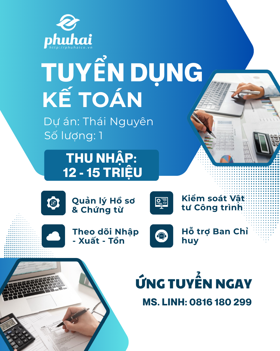 Phú Hải tuyển dụng 01 Kế toán Dự án làm việc tại Thái Nguyên, thu nhập 12–15 triệu/tháng. Vị trí chịu trách nhiệm quản lý hồ sơ kế toán, theo dõi thanh toán, kiểm soát giao nhận và nhập – xuất – tồn vật tư tại công trình. Công việc yêu cầu sự cẩn thận, phối hợp chặt chẽ với chỉ huy trưởng và các bộ phận thi công để đảm bảo tiến độ và chi phí dự án. Phù hợp với ứng viên có kinh nghiệm kế toán công trình, mong muốn môi trường làm việc ổn định và lâu dài. 📞 Liên hệ gửi CV: 0816 180 299