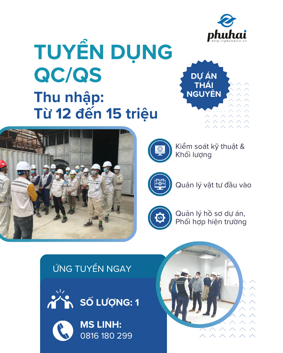 Phú Hải tuyển 01 QC/QS hệ thống MEP làm việc tại dự án Thái Nguyên, thu nhập 12–15 triệu/tháng. Vị trí phụ trách kiểm soát chất lượng và khối lượng các hạng mục Điện, CTN, HVAC tại công trường. Theo dõi thi công theo bản vẽ, tiêu chuẩn kỹ thuật, lập hồ sơ nghiệm thu – thanh quyết toán. Phối hợp cùng đội thi công và chỉ huy trưởng để đảm bảo tiến độ, an toàn và chất lượng dự án. Môi trường làm việc ổn định, đầy đủ chế độ và cơ hội phát triển lâu dài.