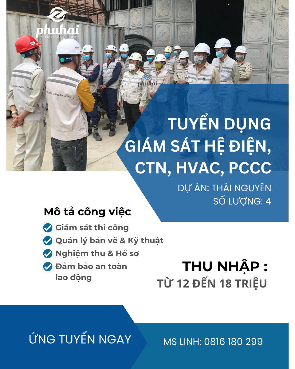 Phú Hải M&E tuyển dụng 04 Kỹ sư MEP (Điện, HVAC, PCCC, CTN) làm việc tại dự án Thái Nguyên. Thu nhập hấp dẫn 18-25tr, đầy đủ BHXH, phụ cấp. Chấp nhận sinh viên mới ra trường. Ứng tuyển ngay!