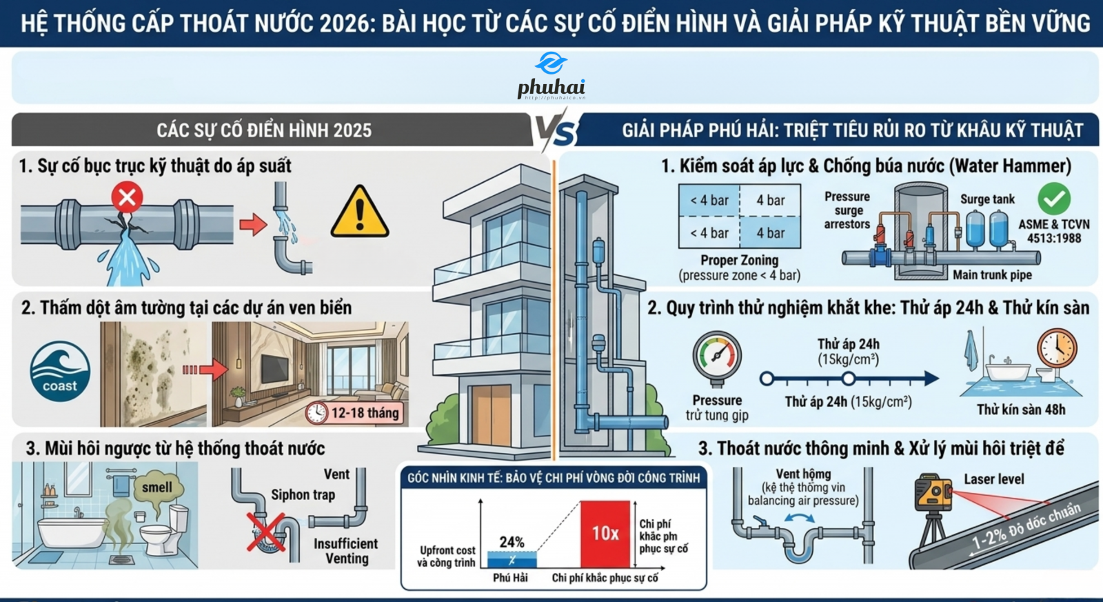 Khám phá tiêu chuẩn thi công MEP tại Phú Hải. Phân tích các sự cố rò rỉ nước điển hình năm 2025 để đưa ra giải pháp chống búa nước, rò rỉ âm tường theo TCVN 4513:1988 và tiêu chuẩn quốc tế.