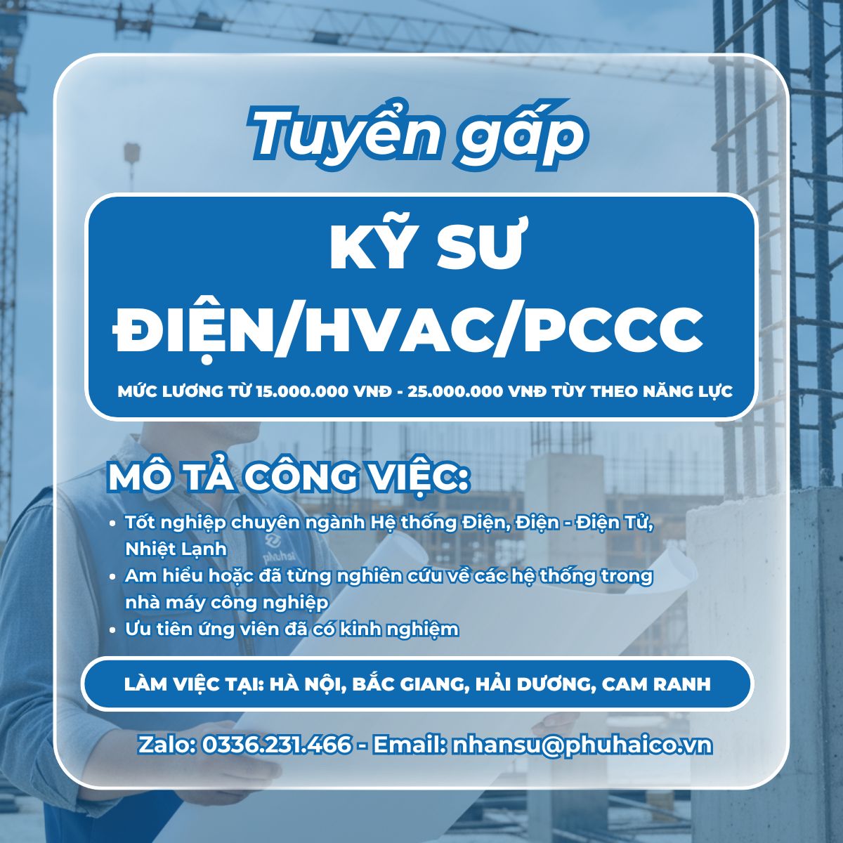 TUYỂN DỤNG GẤP KỸ SƯ ĐIỆN / HVAC / PCCC – LÀM VIỆC TẠI HÀ NỘI, BẮC GIANG, HẢI DƯƠNG, CAM RANH